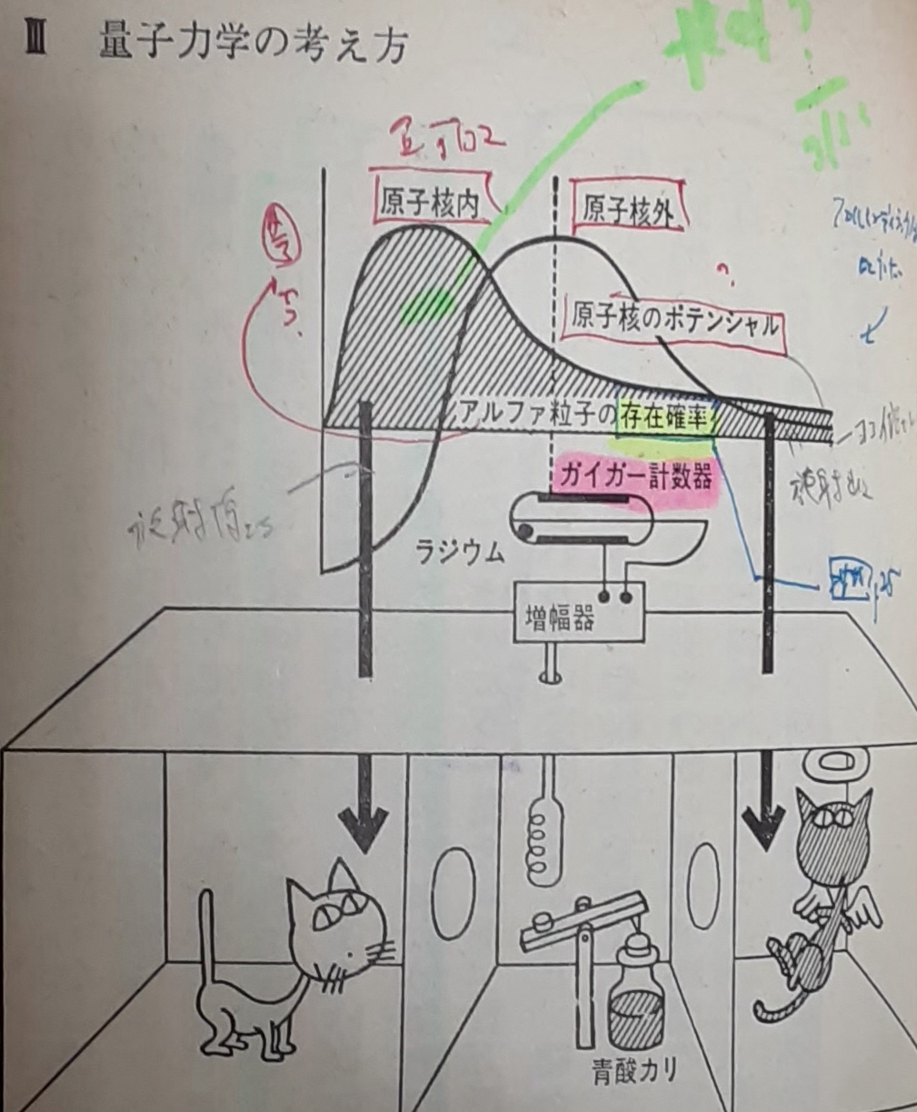 B-101片山義久『量子力学の世界 はじめて学ぶ人のために』1997年第61刷p.137上半分にある「シュレーディンガーの猫」についての質問です(ここだけ論述が不十分であるため理解に困りました)。下記3つの質問に答えて頂けないでしょうか。