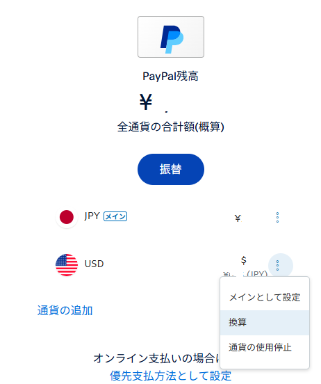 PapPalでUSD(アメリカドル)が少し余っていて、それをJPY(日本円)に交換して出金するには、どうすればよいのでしょうか?