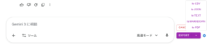 私(管理人)は、それまでGeminiは︙(縦3点リーダー)をクリックすると出てくるGoogleドキュメントへの出力を利用していましたが、ひと質問ごとの出力になるので、AI (Gemini)との会話が長引いた時には不便だと思っていました。