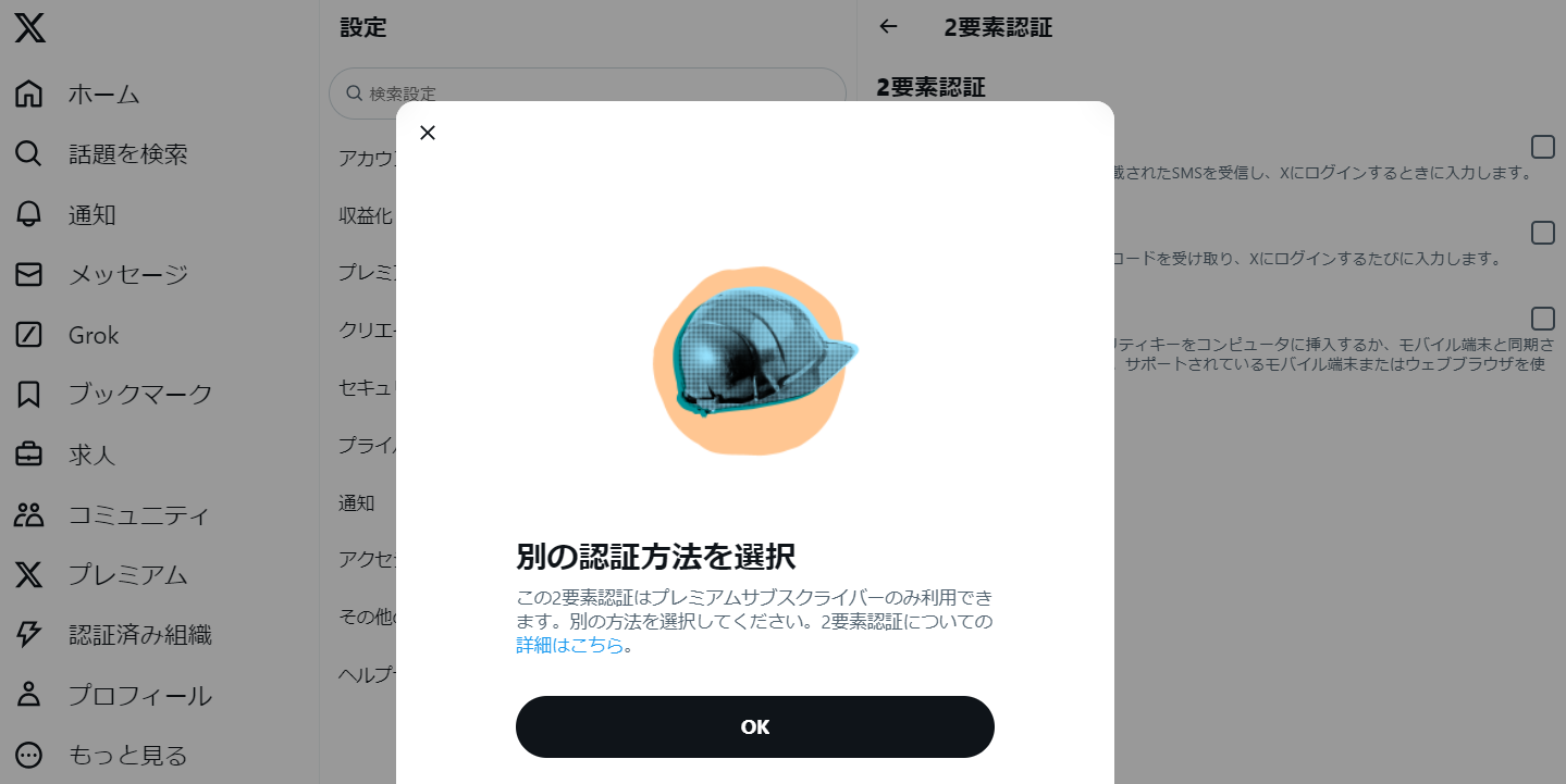 しかし、Twitterでは、SMSの二段階認証は、プレミアム会員(下記)でないとできないみたいです。